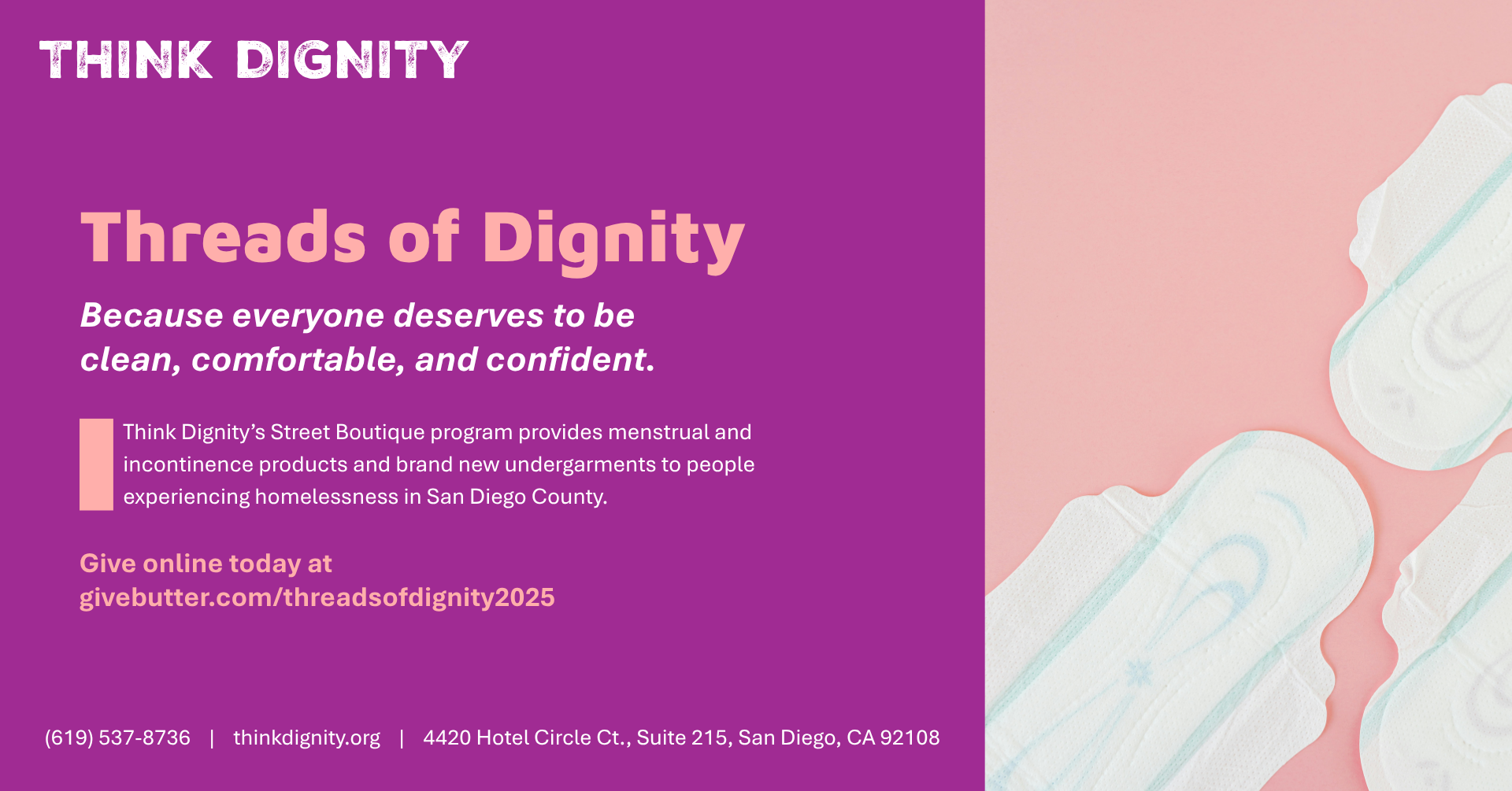 From the Street Boutique to our Basic Dignity Coalition, some programs require a little extra care. Throughout the year, we launch micro-campaigns to raise funds for specific programs and activities. Below are current campaigns that you can support to help Think Dignity continue to restore, defend, and advance basic dignity for unhoused San Diegans.